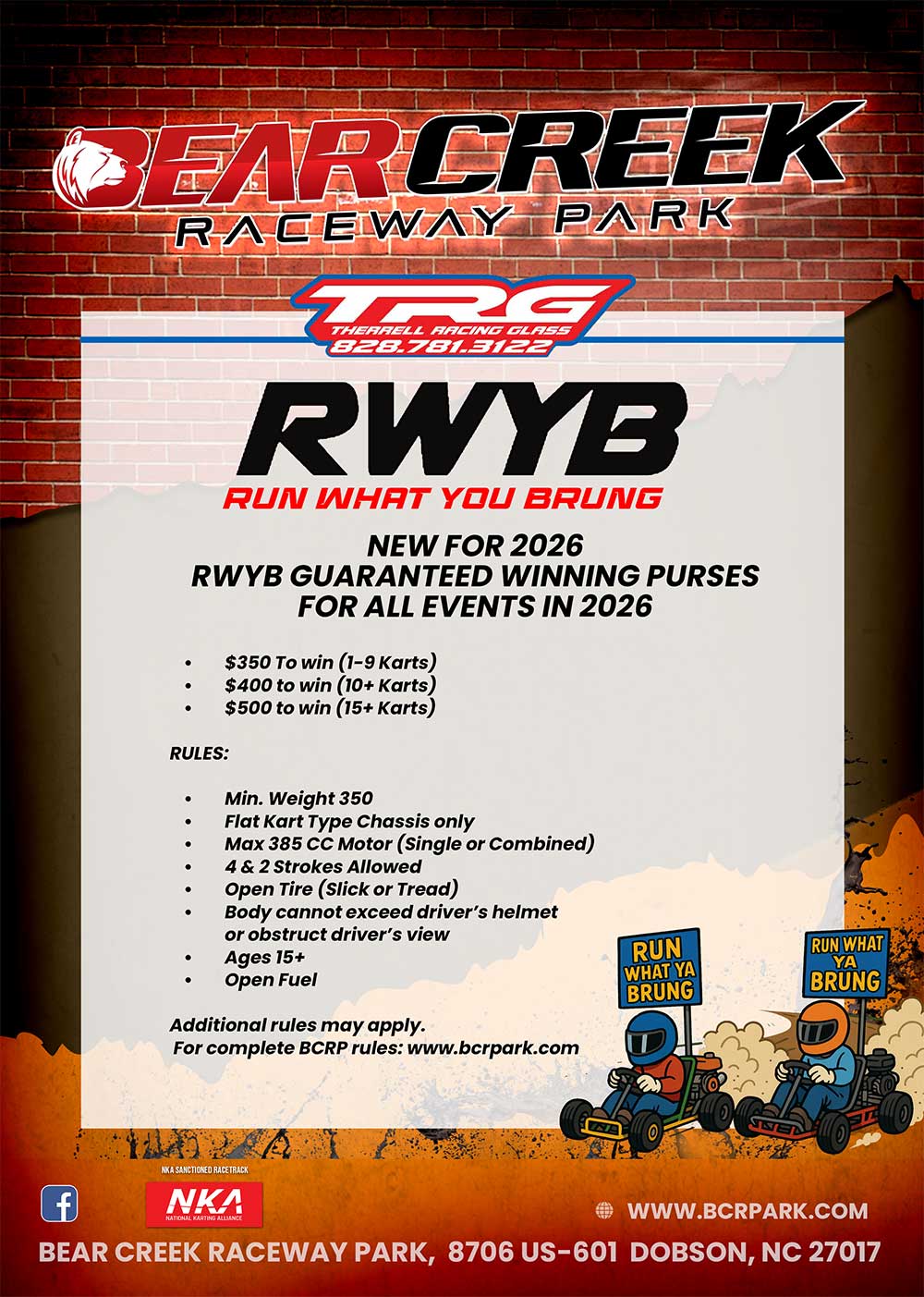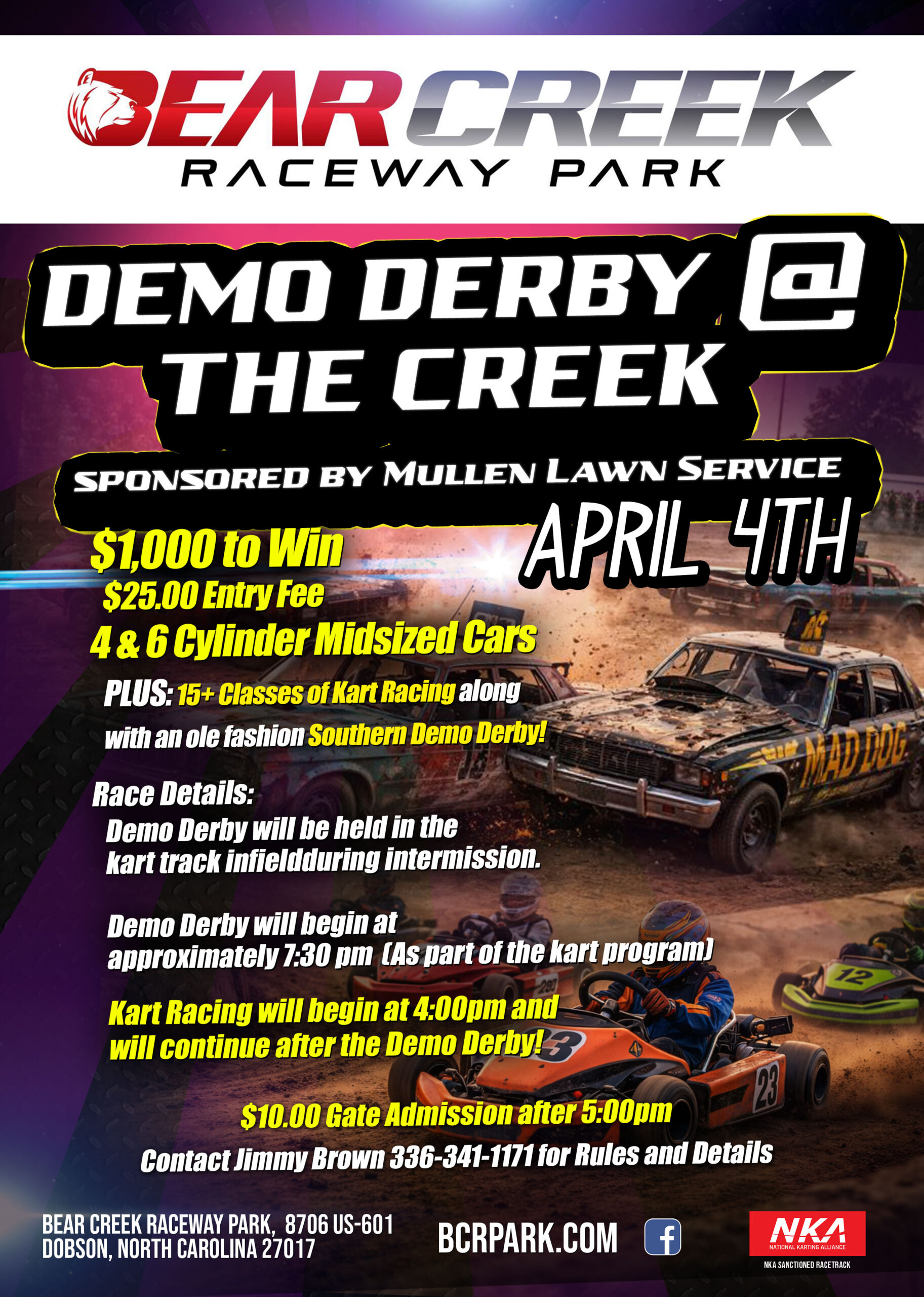 Events Happening Now No Events Coming up Next in 2026Saturday21March12:00 pmFeaturedKarts #1 - St. Patrick's Special Event Event DetailsLocal celebrity charity race Ducar 360, 375 & 390 $500 to win Event Details Local celebrity charity race Ducar 360, 375 & 390 $500 to win Time(Saturday) 12:00 pm CalendarGoogleCal 2026 SEASON SCHEDULE Current Month march 2026Saturday21March12:00 pmFeaturedKarts #1 - St. Patrick's Special Event Event DetailsLocal celebrity charity race Ducar 360, 375 & 390 $500 to win Event Details Local celebrity charity race Ducar 360, 375 & 390 $500 to win Time(Saturday) 12:00 pm CalendarGoogleCal april 2026Saturday04April10:00 amDemo Derby @ The Creek Time(Saturday) 10:00 am CalendarGoogleCal 2026Friday10April12:00 pmFeaturedNLMRC - National Lawn Mower Racing Championships Time(Friday) 12:00 pm CalendarGoogleCal 2026Saturday11April12:00 pmFeaturedNLMRC - National Lawn Mower Racing Championships Time(Saturday) 12:00 pm CalendarGoogleCal 2026Saturday18April12:00 pmKarts #3 - Regular Schedule +SP Heavy Pro Time(Saturday) 12:00 pm CalendarGoogleCal 2026Saturday25April12:00 pmMowers & more #1 Time(Saturday) 12:00 pm CalendarGoogleCal may 2026Saturday02May12:00 pmKarts #4 - TBA Time(Saturday) 12:00 pm CalendarGoogleCal 2026Saturday23May12:00 pmMowers & More #2 Time(Saturday) 12:00 pm CalendarGoogleCal 2026Saturday30May12:00 pmKarts #5 - Regular Schedule +SP Heavy Pro Time(Saturday) 12:00 pm CalendarGoogleCal june 2026Saturday20June12:00 pmKarts #6 - I.T. 43 Annual Event Time(Saturday) 12:00 pm CalendarGoogleCal 2026Saturday27June12:00 pmMowers & More #3 Time(Saturday) 12:00 pm CalendarGoogleCal july 2026Saturday18July12:00 pmKarts #7 - Regular Schedule +SP Heavy Pro Time(Saturday) 12:00 pm CalendarGoogleCal august 2026Saturday01August12:00 pmMowers & More #4 Time(Saturday) 12:00 pm CalendarGoogleCal 2026Saturday15August12:00 pmKarts #8 - TBA Time(Saturday) 12:00 pm CalendarGoogleCal 2026Saturday29August12:00 pmKarts - RAIN DATE Time(Saturday) 12:00 pm CalendarGoogleCal september 2026Saturday05September12:00 pmMowers, Outlaws & Winged Karts #5 Time(Saturday) 12:00 pm CalendarGoogleCal 2026Saturday19September12:00 pmKarts #9 - Hanley 18 Annual Event ($1,800 SP Heavy Pro) Time(Saturday) 12:00 pm CalendarGoogleCal 2026Saturday26September12:00 pmMowers & More #6 Time(Saturday) 12:00 pm CalendarGoogleCal october 2026Saturday24October12:00 pmKarts #10 - TBA Time(Saturday) 12:00 pm CalendarGoogleCal december 2026Saturday12December12:00 pmKarts #11 - Christmas Special W/Santa Time(Saturday) 12:00 pm CalendarGoogleCal