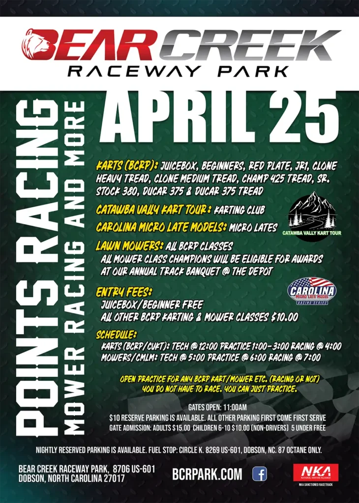 Events Happening Now No Events Coming up Next in 2026Saturday25April11:00 amPOINTS RACING Mower Racing and Morecatawba vally kart tour / carolina micro late models: Time(Saturday) 11:00 am CalendarGoogleCal 2026 SEASON SCHEDULE Current Month april 2026Saturday25April11:00 amPOINTS RACING Mower Racing and Morecatawba vally kart tour / carolina micro late models: Time(Saturday) 11:00 am CalendarGoogleCal may 2026Saturday02May12:00 pmKarts #4 - TBA Time(Saturday) 12:00 pm CalendarGoogleCal 2026Saturday23May12:00 pmMowers & More #2 Time(Saturday) 12:00 pm CalendarGoogleCal 2026Saturday30May12:00 pmKarts #5 - Regular Schedule +SP Heavy Pro Time(Saturday) 12:00 pm CalendarGoogleCal june 2026Saturday20June12:00 pmKarts #6 - I.T. 43 Annual Event Time(Saturday) 12:00 pm CalendarGoogleCal 2026Saturday27June12:00 pmMowers & More #3 Time(Saturday) 12:00 pm CalendarGoogleCal july 2026Saturday18July12:00 pmKarts #7 - Regular Schedule +SP Heavy Pro Time(Saturday) 12:00 pm CalendarGoogleCal august 2026Saturday01August12:00 pmMowers & More #4 Time(Saturday) 12:00 pm CalendarGoogleCal 2026Saturday15August12:00 pmKarts #8 - TBA Time(Saturday) 12:00 pm CalendarGoogleCal 2026Saturday29August12:00 pmKarts - RAIN DATE Time(Saturday) 12:00 pm CalendarGoogleCal september 2026Saturday05September12:00 pmMowers, Outlaws & Winged Karts #5 Time(Saturday) 12:00 pm CalendarGoogleCal 2026Saturday19September12:00 pmKarts #9 - Hanley 18 Annual Event ($1,800 SP Heavy Pro) Time(Saturday) 12:00 pm CalendarGoogleCal 2026Saturday26September12:00 pmMowers & More #6 Time(Saturday) 12:00 pm CalendarGoogleCal october 2026Saturday24October12:00 pmKarts #10 - TBA Time(Saturday) 12:00 pm CalendarGoogleCal december 2026Saturday12December12:00 pmKarts #11 - Christmas Special W/Santa Time(Saturday) 12:00 pm CalendarGoogleCal
