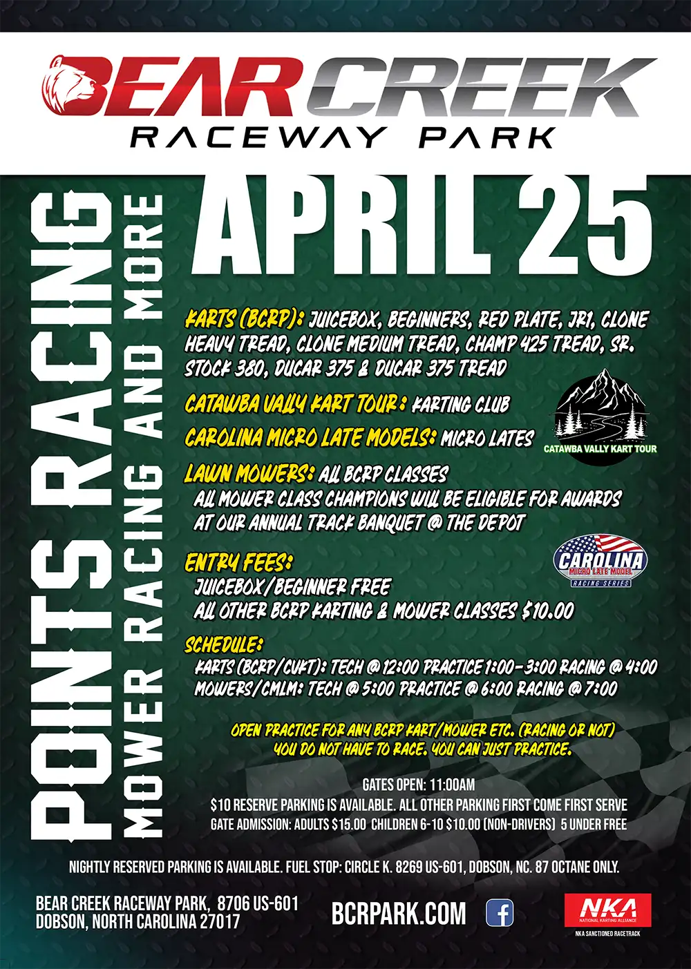 Events Happening Now No Events Coming up Next in 2026Saturday25April12:00 pmMowers & more #1 Time(Saturday) 12:00 pm CalendarGoogleCal 2026 SEASON SCHEDULE Current Month april 2026Saturday25April12:00 pmMowers & more #1 Time(Saturday) 12:00 pm CalendarGoogleCal may 2026Saturday02May12:00 pmKarts #4 - TBA Time(Saturday) 12:00 pm CalendarGoogleCal 2026Saturday23May12:00 pmMowers & More #2 Time(Saturday) 12:00 pm CalendarGoogleCal 2026Saturday30May12:00 pmKarts #5 - Regular Schedule +SP Heavy Pro Time(Saturday) 12:00 pm CalendarGoogleCal june 2026Saturday20June12:00 pmKarts #6 - I.T. 43 Annual Event Time(Saturday) 12:00 pm CalendarGoogleCal 2026Saturday27June12:00 pmMowers & More #3 Time(Saturday) 12:00 pm CalendarGoogleCal july 2026Saturday18July12:00 pmKarts #7 - Regular Schedule +SP Heavy Pro Time(Saturday) 12:00 pm CalendarGoogleCal august 2026Saturday01August12:00 pmMowers & More #4 Time(Saturday) 12:00 pm CalendarGoogleCal 2026Saturday15August12:00 pmKarts #8 - TBA Time(Saturday) 12:00 pm CalendarGoogleCal 2026Saturday29August12:00 pmKarts - RAIN DATE Time(Saturday) 12:00 pm CalendarGoogleCal september 2026Saturday05September12:00 pmMowers, Outlaws & Winged Karts #5 Time(Saturday) 12:00 pm CalendarGoogleCal 2026Saturday19September12:00 pmKarts #9 - Hanley 18 Annual Event ($1,800 SP Heavy Pro) Time(Saturday) 12:00 pm CalendarGoogleCal 2026Saturday26September12:00 pmMowers & More #6 Time(Saturday) 12:00 pm CalendarGoogleCal october 2026Saturday24October12:00 pmKarts #10 - TBA Time(Saturday) 12:00 pm CalendarGoogleCal december 2026Saturday12December12:00 pmKarts #11 - Christmas Special W/Santa Time(Saturday) 12:00 pm CalendarGoogleCal