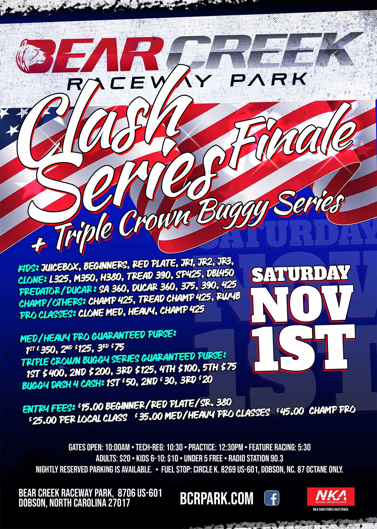 Nov 1st Race Details: Clash Series Finale + Triple Crown Buggy Series Kids: Juicebox, Beginners, Red Plate, JR1, JR2, JR3, Clone: L325, M350, H380, Tread 390, SP425, DBL450 Predator/Ducar: SA 360, Ducar 360, 375,